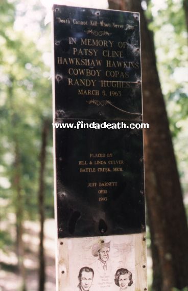 Again, thanks to my buddy Steve Smith for this: According to the book Patsy Cline by Ellis Nassour, husband Charlie Dick brought her body home for viewing (of the casket only. Duh.) in her living room. A prayer service for all four victims was held on Thursday, March 7 at 5:00 p.m., and supposedly 25,000 people showed up for the event. Her actual funeral/burial did not take place until the Sunday after in Winchester, Virginia, March 10, in Shenandoah Memorial Park. Randy Hughes & Cowboy Copas (Randy’s father-in-law) funeral was held Friday morning and Hacksaw Hawkins’ funeral was held Friday afternoon, Patsy’s husband, Charlie went to both funerals. Patsy’s body was returned to Winchester via plane after the prayer service and her funeral/burial was on Sunday, giving her mother and family and Charlie time to return from Nashville. Phew, thanks Steve.